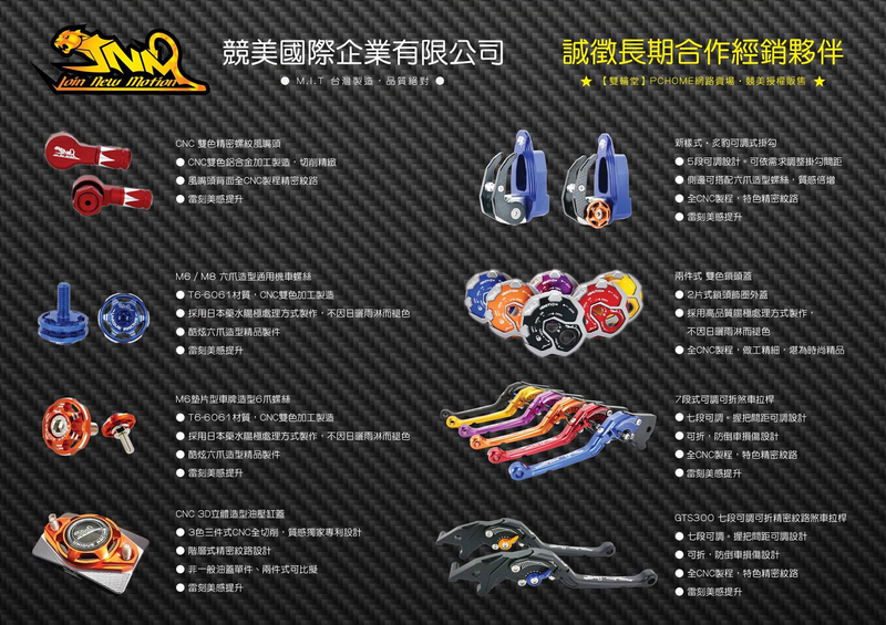 專注於機車改裝部品之研發與設計,並擁有從商品企劃、設計、生產、行銷一貫作業之堅強團隊,商品種類涵蓋各車種之傳動、煞車、車身…..等等各系統之零件,係國內外網路與實體合作之經銷商之最佳選擇,故爾競美國際企業竭誠地邀請您,共同合作一起創造更美好的商機,請直接洽詢或來信洽談,感謝您 !!